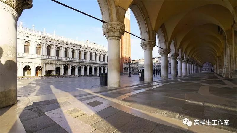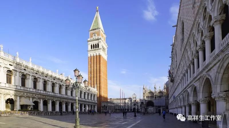 我在圣马可大小两广场转悠过多次,深感圣马可广场是开阔的、舒展的、富有韵味的……。但使我困惑的是:整体感很强的圣马可广场的空间是不同风格的建筑组成:大广场上圣马可教堂立面中既有显明哥特式建筑的垂直构建,又有拱起的拜占庭风格的穹顶和绘画,至于室内,其平面更是典型的基督教堂惯用的十字架平面。广场两侧的建筑,一边是较典型的古典建筑,另一边在古典建风格中渗透了巴洛克风格。两个广场的交叉处是一钟楼,它是大小两广场的制高点和视觉中心。钟楼原为海上航行的瞭望塔,现成为圣马可广场的标志性构筑物,高高耸立的灰红色调的钟楼是什么风格我不太清楚,但钟楼与两边的长廊,与圣马可教堂,与广场的整体环境无论从尺度上还是色彩上评价都很协调。
