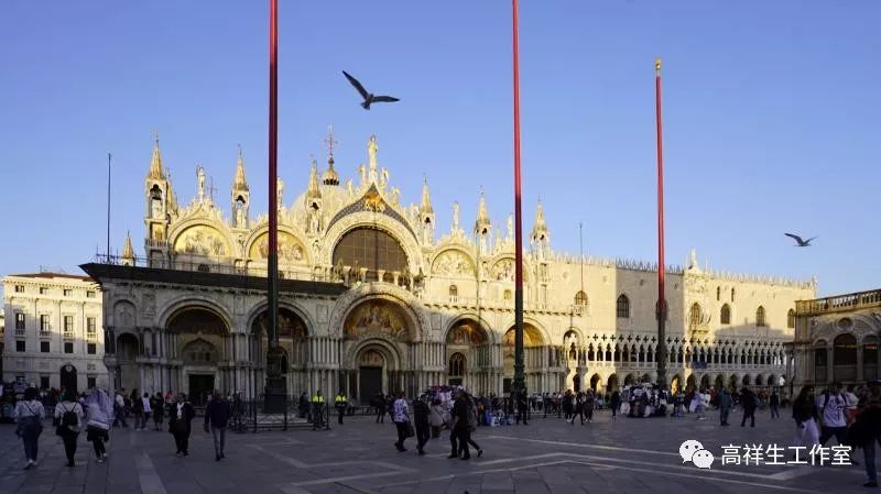 拿破仑说过“圣马可广场是欧洲最美的客厅。”广场一端的圣马可教堂披红戴绿,金光闪闪。在佛晓霞光的衬托下圣马可教堂的形态动人;而阳光照耀下的圣马可教堂更为妩媚,盘旋的海燕使教堂的室外空间更加生动;夜幕下的圣马可教堂和环境都已笼罩在深蓝色的色调里,这时的教堂显得格外安静。