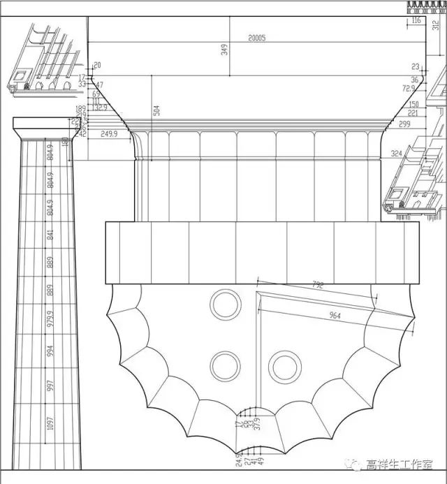 图20古罗马爱奥尼柱式。该图由高祥生工作室根据法国巴黎美术公司成立一百周年之际时该校师生测绘后复原的渲染图重新以CAD形式绘制