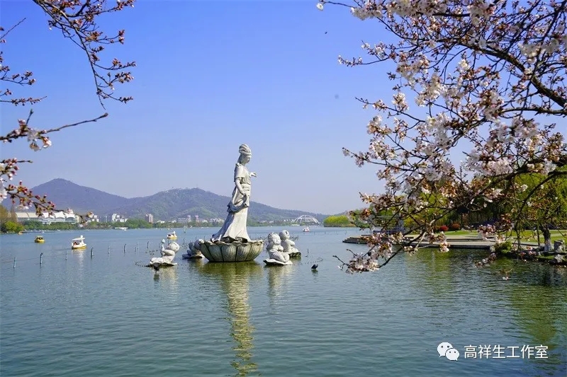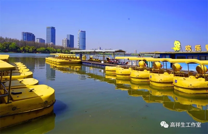 眺望湖面、远山、远景,呈现一幅开阔、舒展、大气的图面:蓝灰色的紫金山,九华山衬托着远处的白色的建筑,衬托着钴蓝色的湖面。湖面上来往穿行着几条明黄色的游艇,游艇划开的水面留下几道白色的水浪。这蓝色的天空,淡灰色的山体,与黄色的游艇,与湖岸上的建筑、植物、小品和游人构成了一幅阳光明媚的图画。