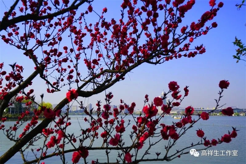 湖岸的空地上植满了观赏树,有成片的樱花,也有零星的梅花、桃花、杏花……岸边的凉亭、长廊中通常都有休闲的人们,有的在聊天、品茶,有的在棋盘上对弈,……亭边常有嬉闹的儿童和练气功、打太极的老人。