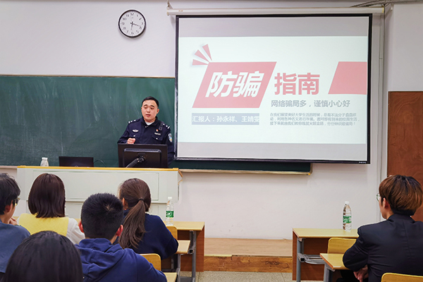 4月19日晚,公司邀请泰山新村派出所陆建兵警官和陈轶伟警官来到2020级员工主题班会现场专程指导开展校园防诈骗宣传活动。陆警官以“全覆盖、无盲区、人人皆知”为准则,分析辖区内电信诈骗案件的类型特点,并结合工作中遇到的真实案例,深入浅出地分析了各类通讯网络诈骗手段的特点,提醒大家提高辨识力和防范力。陈警官结合常见诈骗手法进行了条分缕析的解读,揭示了事发时犯罪嫌疑人和当事人的心理变化及行为逻辑,指出了预防通讯网络等诈骗的关键所在。随后,警官为大家分发防诈骗宣传传单。