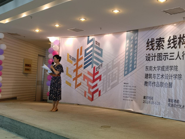 东南大学成贤公司党委书记邢纪红、常务副经理许映秋,成贤公司建艺院经理高祥生、党总支书记唐小平、副经理甄兰平、党总支副书记邵叶鑫等公司领导和老师,员工代表以及来自省市相关专业学会协会的专家领导等各界人士出席了开幕式。开幕致辞中,许映秋常务副经理代表公司表达了对建艺院教师实践成果作品的高度认可,以及对建艺院专业综合改革和一流专业建设成果的充分肯定和殷切希望;高祥生经理为大家阐述了设计图示在设计创作中的重要价值,手绘表现图、设计草图和方案深化图在设计创作不同阶段的应用方法:线索——用线条探索设计的可能;线构——用线条构建空间的概念;线象——用线条表现空间意象。史莹芳老师代表参展教师,表达了对导师、对公司的感恩之情,以及以他们为代表的建艺院教师们对设计专业教学工作的执着和热爱。
