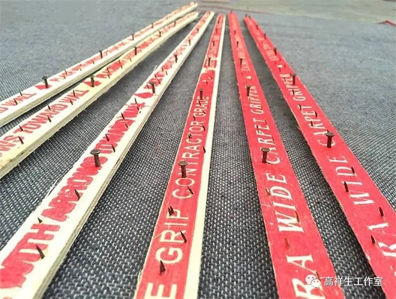 为保证地毯展平后不因外力而变形,多数情况下需加以固定。固定的方法有两种,一是用挂毯条固定;二是粘结固定。