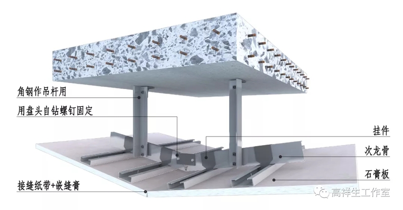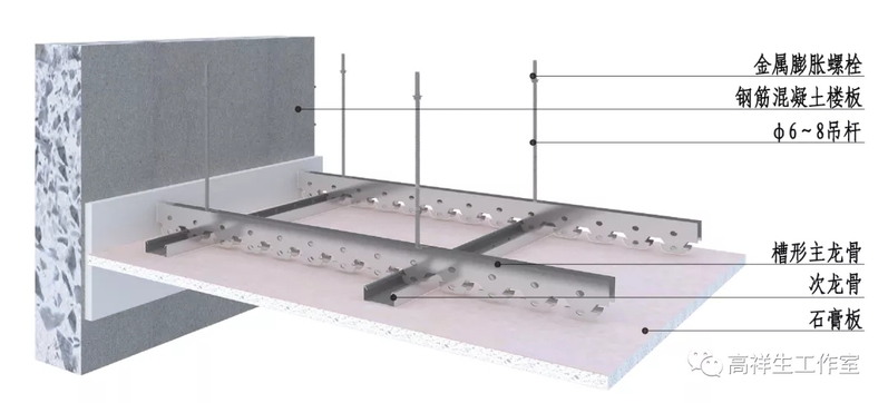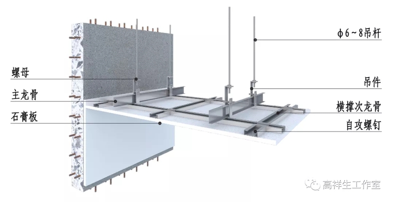 顶棚装饰的基本构造包括吊筋、龙骨和面层三部分。吊筋通常用圆钢制作,截面一般应不小于 φ6 mm。钢龙骨由薄壁镀锌钢带制成,有 38、50、60 三个系列,可分别用于不同的盒子;铝合金龙骨,由型材制成,分为轻型、中型、重型三个系列。顶棚面层采用纸面石膏板、不燃板、铝合金板、塑料扣板等。