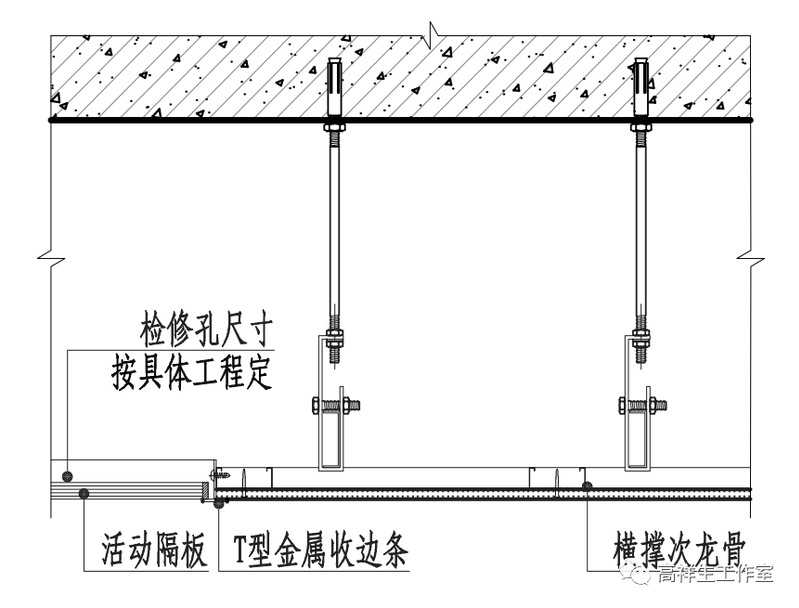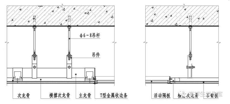 ⑤ 按承载能力分有上人式顶棚和不上人式顶棚。上人式顶棚要求有较大的强度与适当的内部空间,主龙骨要能承受 80 ~ 100 kg 的荷载,顶棚上部的空间高度应为 0.9 ~ 1.5 m。同时需预留检修孔,设具有足够强度的检修道。不上人式顶棚上部空间的高度相对较低,龙骨的荷载力亦可适当降低。