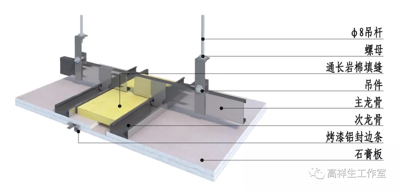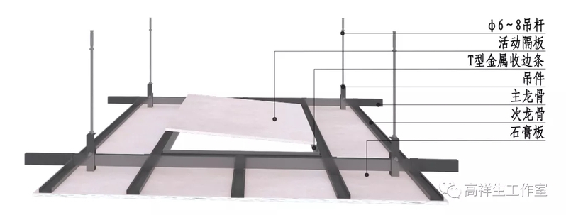 ④ 按装饰面材分,主要有石膏板顶棚、矿棉板顶棚、金属板顶棚、木质顶棚以及玻璃顶棚;