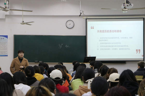 江老师鼓励新生团员在学习团史、团章中坚定理想信念、心系广大同学、提高工作能力、锤炼优良作风,她提出了四点希望:发挥党的助手和后备军的作用,为党的事业,教育团结带领青年;发挥好国家政权社会支柱的作用;发挥党和政府联系青年群众和桥梁纽带作用;发挥好组织青年,引导青年,服务青年的作用。随后,球王会分团委副书记陈会凡学姐带领大家进行“团内推优”工作培训。