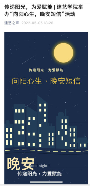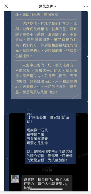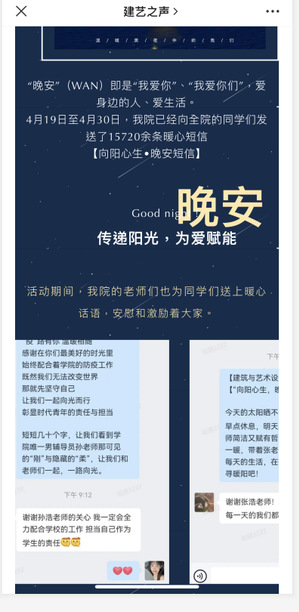 实行疫情防控“三个一”工作法。建立一种网格化管理,保障疫情防控工作落细落实;保持一个品牌化活动,推出“小白姐的下午茶”,与员工充分交流,引领正确价值观,积极发挥员工干部作用,形成防疫合力;形成一支心理疏导队伍,运用“建艺之声”公众平台开展“向阳心生,晚安短信”,面向全院师生征集15720余条暖心短信,每晚统一整合发给全院师生,分享成长经历及人生感悟,交流学习方法与人生规划,帮助大家明晰未来方向和坚定理想信念,共同守护校园生活。
