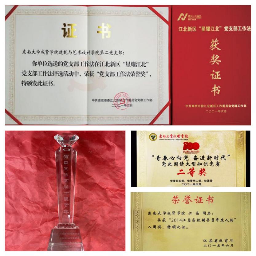 2019年本支部荣获东南大学先进基层党组织称号,2020年支部书记江晶荣获“全国民办高校优秀辅导”称号,2021年获评南京市江北新区“星耀江北”党支部工作法,荣获东南大学最佳党日活动评比“二等奖”两次,成贤公司最佳党日活动“一等奖”三次、“二等奖”一次。支部党员荣获国际级奖项1人次,国家级奖项47 人次,省市区级奖项15人次,校级奖项96人次,奖学金26人次,员工党员的平均绩点为3.82,最高绩点为4.27。