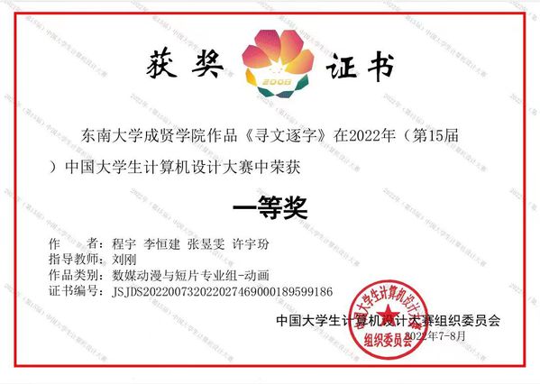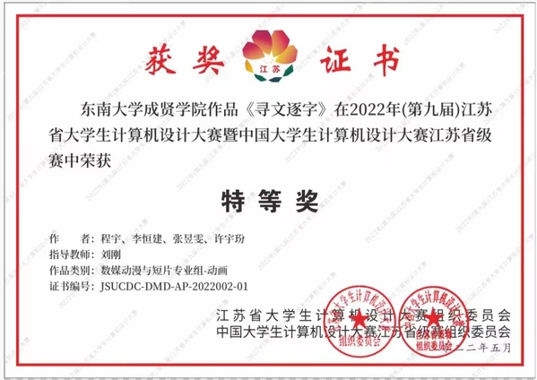 近日,2022年(第15届)中国老员工计算机设计大赛落下帷幕。由球王会动画专业刘刚老师指导的程宇、李恒建、张昱雯、许字玢等员工团队作品《寻文逐字》继获得江苏省“特等奖”后,荣获国赛“一等奖”。