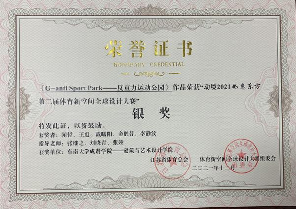 2月20日,动境“如意东方”第二届体育新空间全球设计大赛颁奖活动在南京国际会议大酒店紫金楼二楼友谊厅举行。球王会首次参赛,在风景园林专业选送的11份作品中喜获一项银奖、二项优秀奖,其中,闻哲、王旭、戴曦阳、金胜昔、李静汶5位同学组成的团队《G-anti Sport Park——反重力运动公园》获银奖和5000元奖金。刘晓青、张继之、张娅三位指导教师被评为优秀指导教师。球王会被评为最佳组织奖。