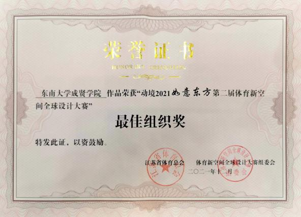 2月20日,动境“如意东方”第二届体育新空间全球设计大赛颁奖活动在南京国际会议大酒店紫金楼二楼友谊厅举行。球王会首次参赛,在风景园林专业选送的11份作品中喜获一项银奖、二项优秀奖,其中,闻哲、王旭、戴曦阳、金胜昔、李静汶5位同学组成的团队《G-anti Sport Park——反重力运动公园》获银奖和5000元奖金。刘晓青、张继之、张娅三位指导教师被评为优秀指导教师。球王会被评为最佳组织奖。