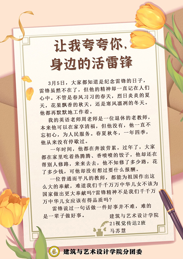 31-5球王会分团委组织开展“让我夸夸你,身边活雷锋”学雷锋活动通过“建艺之声”微信公众号进行全校征集,共收到179份感谢信。球王会分团委员工干部、第二党支部员工党员等担任志愿者,分类整理了每一封来信。在信中温暖人心的故事里,主人公可以是身边的同学、老师、亲朋,可以是公司的宿管、保安、保洁,也可以是任何一位不知道姓名的陌生人,他们都是身边的“活雷锋”,让雷锋精神在新时代有了新的阐释。