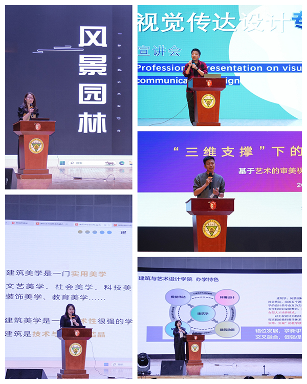 来自各教研室的教师王峰、刘刚、陈宁静、刘晓青和潘瑜,分别对视觉传达设计、动画、建筑学、风景园林和环境设计作专业学习教育。他们从专业课老师的角度,介绍了各专业的课程体系和今后的学习目标,以便让新生们快速了解各自的专业,为今后的专业学习打下基础。