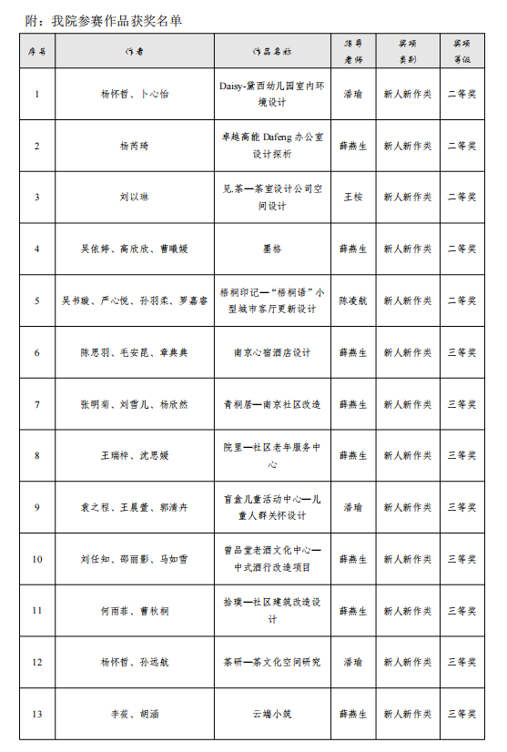 大赛经过数月作品征集和专家多轮评审,共产生一等奖19个,二等奖40个,三等奖74个。公司环境设计专业教师指导的员工团队作品荣获新人新作类二等奖5个,三等奖8个,优秀奖8个(具体获奖名单和奖项详见附表)。薛燕生教师团队创作的《南京师范大学餐厅改造》获公装方案类二等奖。王桉、潘瑜、薛燕生、陈凌航四位教师荣获优秀指导老师奖。