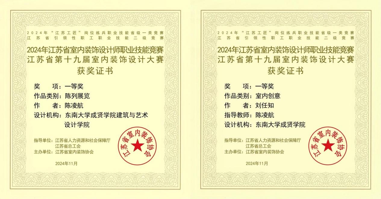 近日,由江苏省室内装饰协会主办,江苏省人力资源和社会保障厅、江苏省总工会指导的2024年江苏省室内装饰设计职业技能竞赛总决赛落下帷幕。球王会教师陈凌航获得职工组陈列展览类一等奖,2022级环境设计2班刘任知获得员工组室内创意类一等奖,陈凌航老师获优秀指导教师。